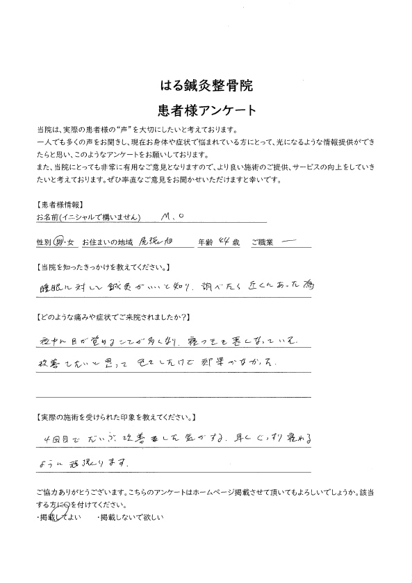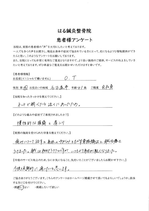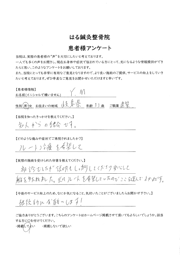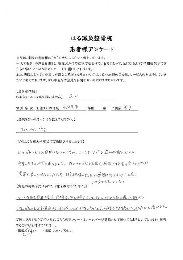 ルート鍼を見せてもらった時は、少し怖かったです。いつもの鍼と違い、刺したときの痛みも結構ありましたが、しっかり治したいので、今後も継続していきたいと思います。