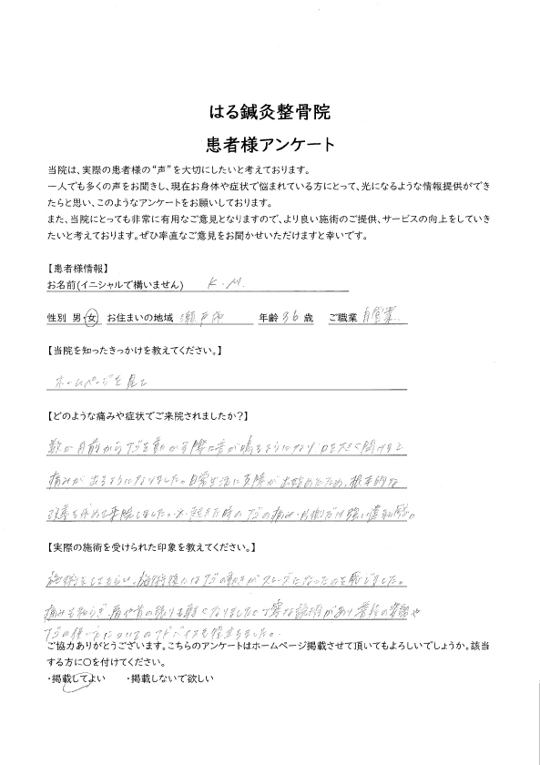 施術をしてもらい、施術後にはアゴの動きがスムーズになったのを感じました。痛みも和らぎ、肩や首の張りも軽くなりました。丁寧な説明があり、普段の姿勢やアゴの使い方についてのアドバイスも役立ちました。