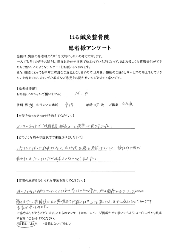 パソコンを使った仕事が多く、長時間画面を見続けることで、慢性的に目が疲れていました。なかなか改善されないので来ました。
