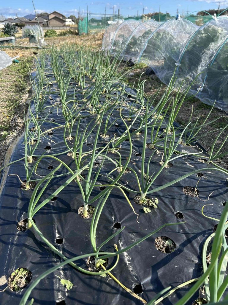 玉ねぎは、もともと丸く穴の開いたマルチで植えるのですが、そこから草が生えてきます。本当に草の生命力は恐ろしいです。野菜たちも草のように頑張ってもらいたいものです。